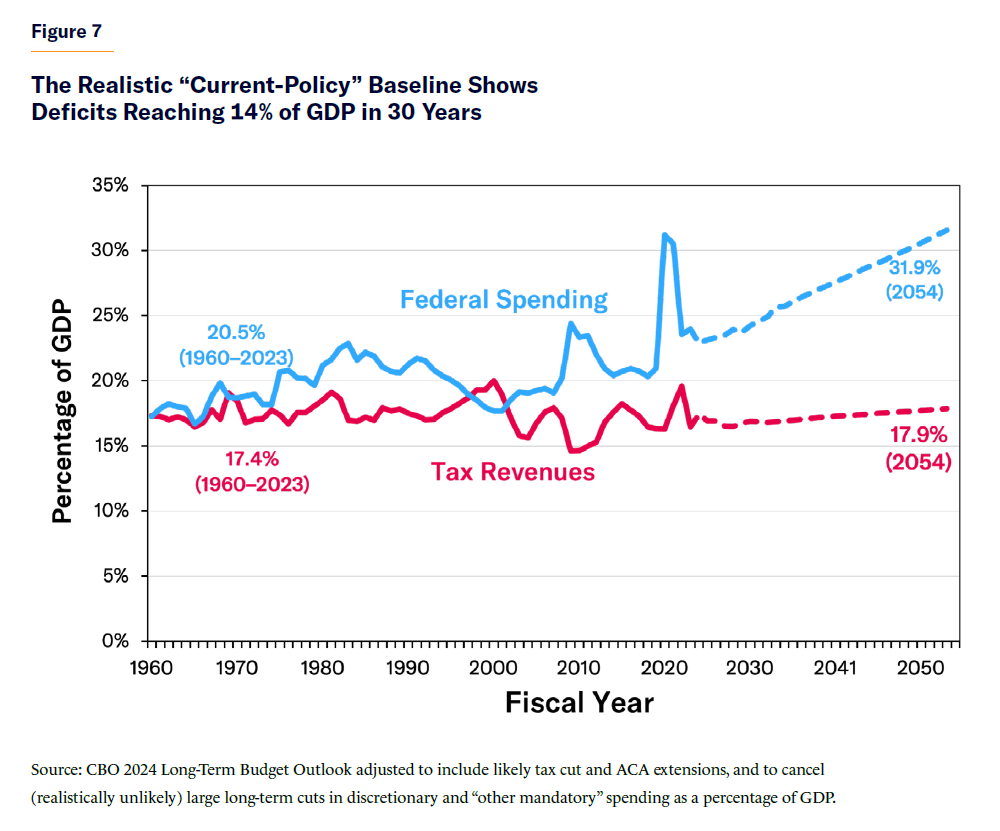 Nor are future deficit projections driven by declining tax revenues. Since 1960, tax revenues have typically remained close to their average level of 17.4% of GDP. And over the next 30 years, tax revenues are projected to range between 17.9% and 18.9% of GDP, depending on whether the 2017 tax cuts are extended. However, federal spending—which has averaged 20% of GDP since 1960—has already risen to a current level of 24% of GDP and is projected to leap as high as 32% of GDP over 30 years (see Figure 7).[22] These tax-revenue levels are surely lower than many progressives would prefer, and probably lower than the revenue level required for a bipartisan solution to stabilize the debt. But it is simply mathematically incorrect to claim that soaring projected budget deficits are driven by declining revenues rather than rising spending levels as a share of the economy. In other words, falling tax revenues are not creating the problem of surging deficits, although some degree of higher taxes will likely be part of a balanced solution.