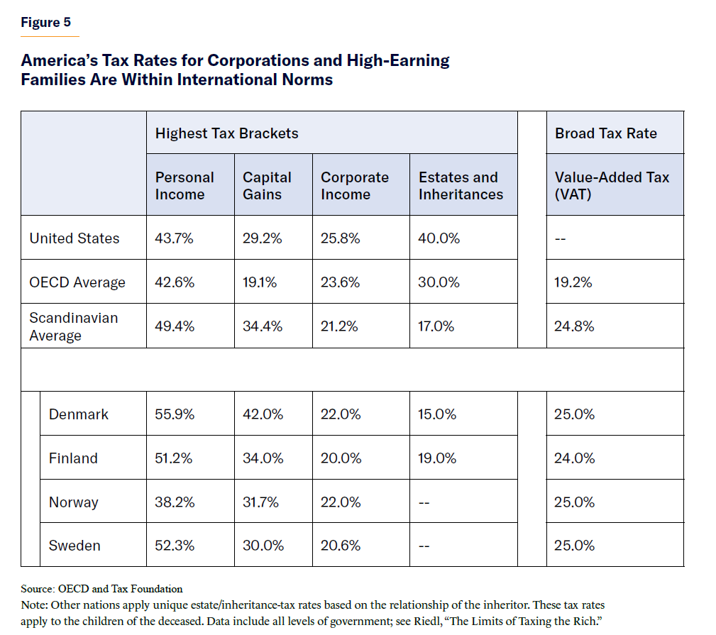 Moreover, top rates imposed on corporations and wealthy families in the U.S. often exceed OECD averages (see Figure 5). America’s top average income-tax bracket of 43.7% (including state) taxes slightly exceeds the OECD average of 42.6%. America’s highest tax brackets also exceed the OECD average for capital-gains taxes (29.2% vs. 19.1%), corporate income taxes (25.8% vs. 23.6%), and estate/inheritance taxes (40% vs. 30%). In fact, America’s corporate and estate/inheritance-tax rates well exceed those of all Scandinavian nations.[20]