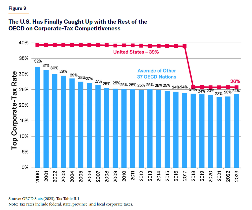 Advocates of substantially higher corporate taxes often assert that the U.S. currently coddles corporations by taxing them far below international norms. Once again, this is false. When including state taxes, America’s 25.8% statutory corporate-tax rate is tied for the 13th-highest among 38 OECD nations—and exceeds all four Nordic nations, which range from 20% to 22%. In fact, before the 2017 tax cuts, the U.S. corporate-tax rate of 39% (including state taxes) exceeded that of all other OECD nations (see Figure 9).[37]