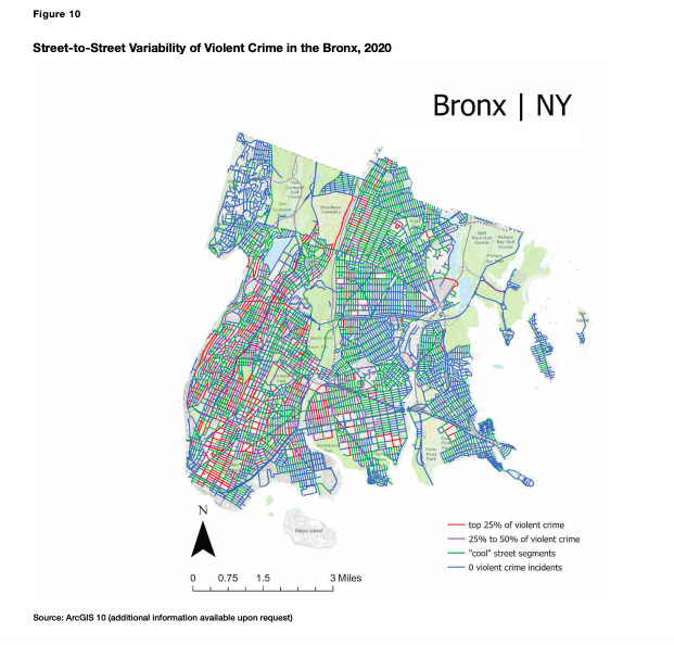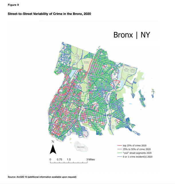 Figure 9 zooms in on the geography of the Bronx, one of the higher-crime boroughs in 2020. It shows four crime-level patterns. The hottest hot spots (the 1.4% of streets in the city producing 25% of crime) are in red; the next level of hot spots (the additional 4.3% of street segments producing 25%–50% of crime) are in purple; the streets with little or no crime (zero or one crime report in a year) are blue; and others (which might be termed “cool spots”) are in green. The first conclusion to be drawn: the majority of Bronx streets have little or no crime or relatively low crime levels. Blue and green are the dominant colors on this map. Second, the hot-spot streets are spread across communities in the borough, though there are far fewer in its northeastern sections. Even in the southwestern areas, which have many more hot spots, blue and green streets are the majority.