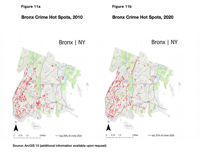 An important question is whether the crime hot spots stay relatively stable geographically. We map the hottest crime streets in the Bronx to illustrate this pattern for 2010 and 2020 (Figure 11a and Figure 11b). It is apparent that the geographic patterns of the maps are similar. This does not mean that streets do not change in terms of their crime levels, but it does suggest a good deal of stability across time. This is reinforced by looking at the streets in the Bronx that were in the highest hot-spot group (which produced 25% of crime in the city) in 2010 and asking whether they continued to be so in 2020. Of streets that were high-crime hot spots in 2010 (top 25% of crime), almost half (50%) were high-crime hot spots in 2020. An additional 45% of streets moved from the highest hot-spot category to the second category (which produced 25%–50% of crime). This suggests that nearly all the streets that were hot spots as we have defined them in 2010 were also hot spots in 2020.