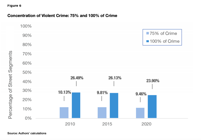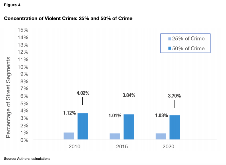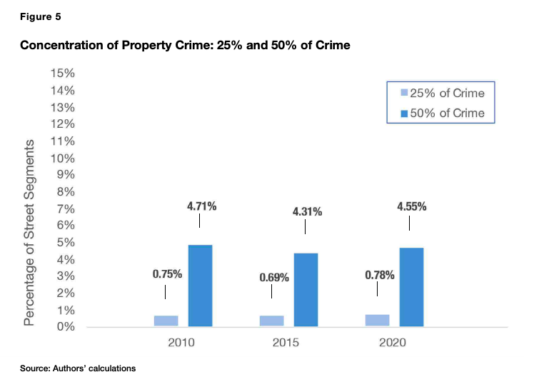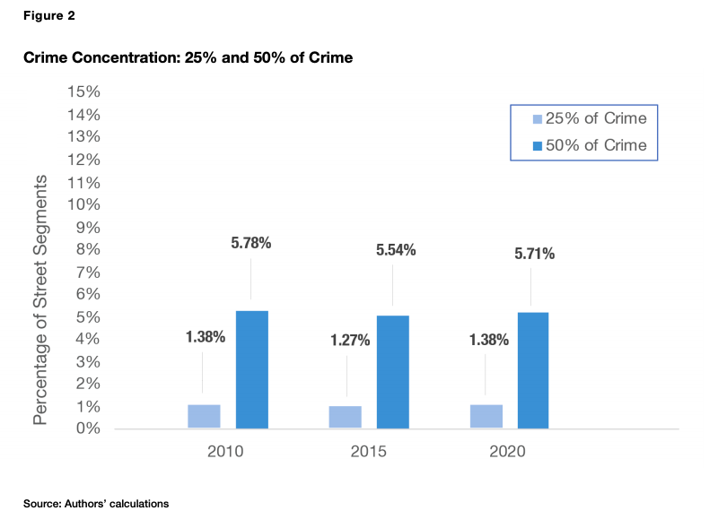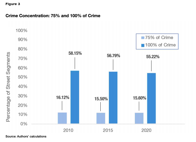 Our report looks beyond general crime statistics to the hot spots of crime where much crime in a city is concentrated. Looking at NYPD crime reports for 2010, 2015, and 2020, we find that about 1% of streets in NYC produce about 25% of crime, and about 5% of streets produce about 50% of crime. This is consistent across the three years, showing that a very small proportion of streets in the city are responsible for a significant proportion of the crime problem.