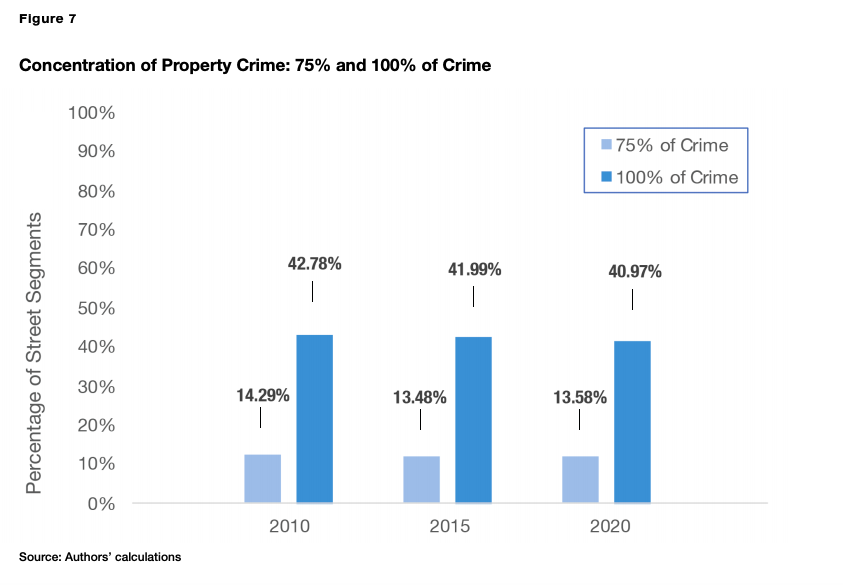 Looking at the 75% and 100% concentrations, we found that 75% of the violent crime on street segments was committed on about 10% of city streets in the three years, and 100% on about 25% of city streets (Figure 6). For property crime, which is much more common in these data, the results are closer to those of general crime trends. About 14% of streets in the city produce 75% of property crime, and about 40% produce 100% of property crime (Figure 7).