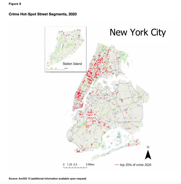 An important issue for assessing the spread of policing in a city is the geographic distribution of crime hot spots. Are they located only in a specific NYC borough or in very specific neighborhoods? Or are they spread across the city? Is there strong street-by-street variability, or are hot spots really “hot neighborhoods”? A map showing the hottest street segments in NYC (the top 1.4% of street segments producing 25% of crime) for 2020 is in Figure 8. It shows us that there are very high-crime hot spots in each of the city’s boroughs, though the number varies. The largest concentrations of hot spots are found in Manhattan, Brooklyn, and the Bronx, representing the most densely populated and urban parts of the city.