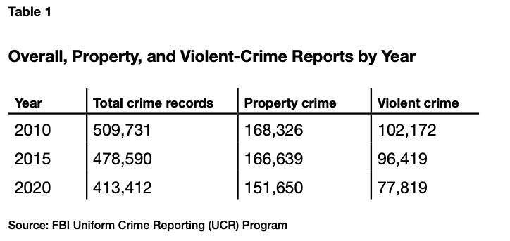 Looking only at violent and property crime, there were also meaningful declines. There were 102,172 violent-crime reports in NYC in 2010 but fewer than 80,000 violent crimes in 2020, a drop of almost 25%. A smaller decline in crime was found for property crimes. While there were almost 170,000 property-crime reports in 2010, there were 151,650 in 2020, a drop of almost 10%.
