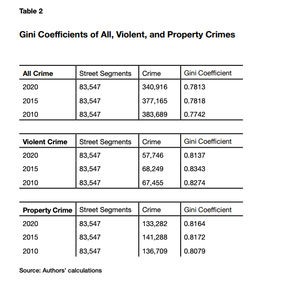 Distributions of concentration may be affected by the relative proportion of crimes to the number of streets in a city (Bernasco and Steenbeek, 2017). A common metric for overcoming such distributional biases is to use the generalized Gini coefficient, which provides a metric between 0 and 1, whereby 1 suggests total concentration (in a single unit) and 0 suggests total spread across geographic units. Using this approach (Table 2) we again find evidence of very strong concentration, with violent and property crime marginally more concentrated than crime generally. For all crime, the generalized Gini coefficient varies between 0.77 and 0.79 across the three years studied, for violent crime between 0.81 and 0.84, and for property crime between 0.80 and 0.82. These data reinforce the conclusion that the concentration levels in the city remained stable despite the crime declines that are observed.