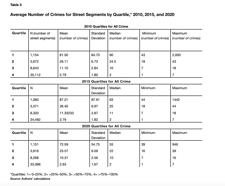 While many NYC streets had high crime levels during these years, the large majority of street segments had relatively low levels of crime. The lowest quartile, producing the remaining 25% of crime in the city, included 33,096–35,112 street segments over the three observation years. These streets averaged 2.6–2.8 crimes per year. If we add to this group the street segments with no crime, we gain a total of more than 68,000 streets in 2010 and more than 72,000 streets in 2020. The highest crime level for this group of street segments in a year is seven across the three observation years. This suggests that, overall, most streets in the city do not need intensive police interventions, though sporadic police attention for some streets that have as many as seven crimes in a year is likely warranted.