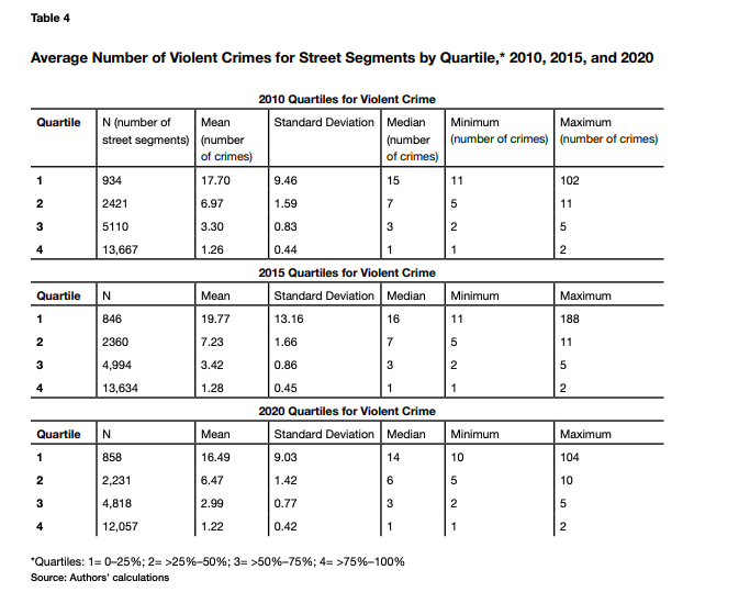 Violent crimes are particularly concerning for citizens; accordingly, assessing violent-crime levels on NYC streets is important (Table 4). About 20,000 street segments have at least one violent crime in each of the three observation years. In 2010, 934 street segments produced 25% of NYC’s violent crimes. In that year, the average number of violent crimes found on these high-crime streets was 17.7 (median 15). In 2015, the mean number of violent crimes for streets in this top quartile (N=846) was 19.8 (median 16). In 2020, the mean number of violent crimes for streets in this quartile (N=858) was 16.5 (median 14). It’s apparent that many streets have very high violent-crime levels across the three years, despite the strong crime decline citywide over the past few decades.