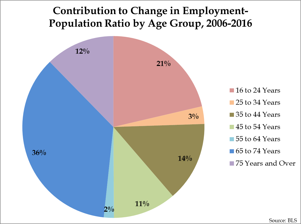 However, some of the decline in the employment-population ratio over the past decade is due to the aging (and retirement) of the population; indeed, this is often used as an excuse to claim the economy is doing better than it really is. To test this argument, I calculated what share of the 3.7 percent decline in the employment-population ratio since 2006 can be explained by changes in each of seven age groups.