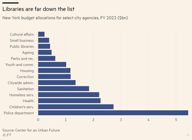 Nearly three years later, in early 2023, progressive city council members carried this line of reasoning into a new budget season. The city council’s progressive caucus, comprising 19 of the council’s 51 members,[2] says that as a statement of principle, it will “do everything we can to reduce the size and scope of the NYPD … and prioritize and fund alternative safety infrastructure that truly invests in our communities.”[3] Progressive council member Tiffany Cabán of Queens, juxtaposing library spending against police spending, observed that “the mayor is trying to cut $75 [million] from libraries over the next four years.… $75 [million] is 0.013[%] of the NYPD’s operating budget for just one year.”[4]