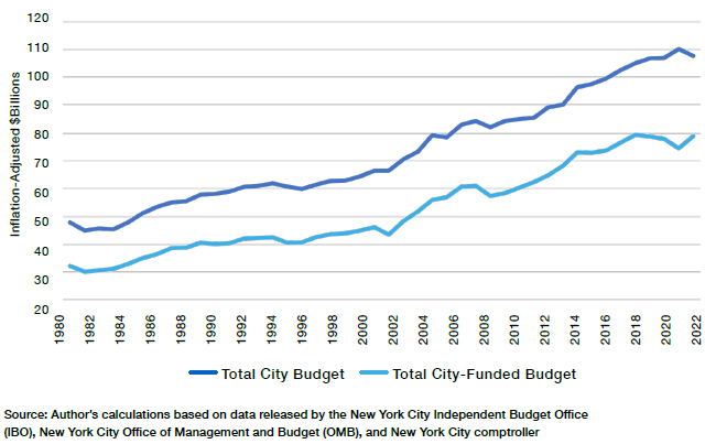 Over the four decades since New York City began emerging from the fiscal crisis of the 1970s, during which a state board temporarily took control of local finances, NYC’s municipal budget rose consistently, far outpacing inflation (Figure 2). In fiscal year 1980, NYC spent about $13.5 billion, or $47.9 billion in inflation-adjusted equivalents. In fiscal year 2023, the city spent $107.6 billion annually, representing an increase of 124.5% in real terms. Counting only spending funded by city taxpayers (that is, subtracting federal and state grants), city spending in 1980 was $32.2 billion in today’s dollars; by 2023, it was $78.8 billion, or an increase of 144.6% from 1980 levels.[7]
