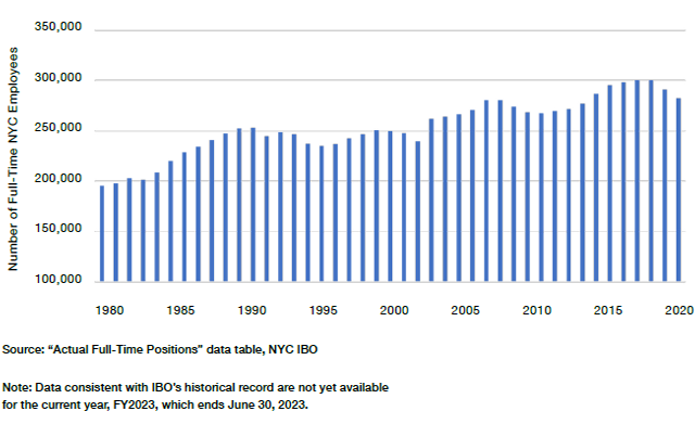 In 1980, NYC employed 195,563 full-time workers. In 2022, the figure was 282,498. Though the 2022 figure was down from the all-time highs of 2019 and 2020—when full-time employment topped 300,000—it still represented growth of 44.5% over four decades (Figure 3).[9] Though the full FY2023 data are not yet available, additional data show the city workforce continuing to decline in FY2023 because of high vacancy levels after pandemic-era resignations and retirements.[10]