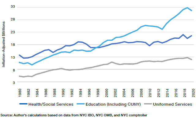 By far, the fastest-growing category of spending is public education. In 1980, inflation-adjusted spending on education (including on the City University of New York) was $10.8 billion. By 2021, such spending was $31.7 billion, representing real growth of 193.5%. By contrast, spending on the uniformed services—fire and sanitation, in addition to police and corrections—grew from $5.3 billion to $12 billion, which is growth of 126%. This means that the growth in spending on uniformed services is in line with overall city spending growth (including federal and state grants), but the growth is still slower than city-funded spending growth (not including such grants).[11]