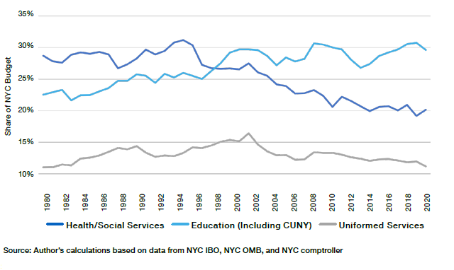Because of the city’s changing spending priorities over the long term, the city’s four uniformed services have only maintained their share of the entire city budget, at 11% in 1980 and 11.2% in 2021 (Figure 5). By contrast, the share of the budget consumed by education has grown from 22.5% to 29.6% of the overall city budget, or 31% growth in share.