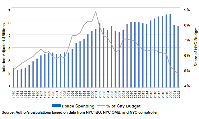 Since mid-2020, government spending on American police departments has come under intense scrutiny nationwide. The New York Police Department (NYPD) is no exception. Left-wing critics supporting the “defund the police” movement charge that spending on police is crowding out necessary spending on civilian agencies that provide education, housing, health care, and social services. Even moderate Democrats and supposedly neutral news outlets accept the premise that police spending is either too high, relative to the rest of the city budget, or, at minimum, keeping up with the rest of the city budget.