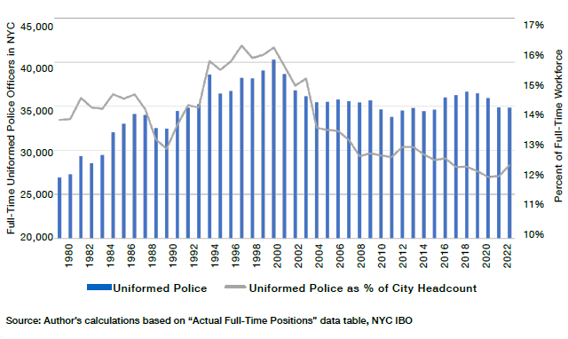 The impact of a smaller police budget in the context of the overall city budget is clear from the size of the city’s policing workforce. Though the city’s workforce (including unarmed civilian police workers, such as school-safety agents) has grown over the past 40 years, the uniformed police department has not kept up and, in recent years, has seen significant relative shrinkage.[12]