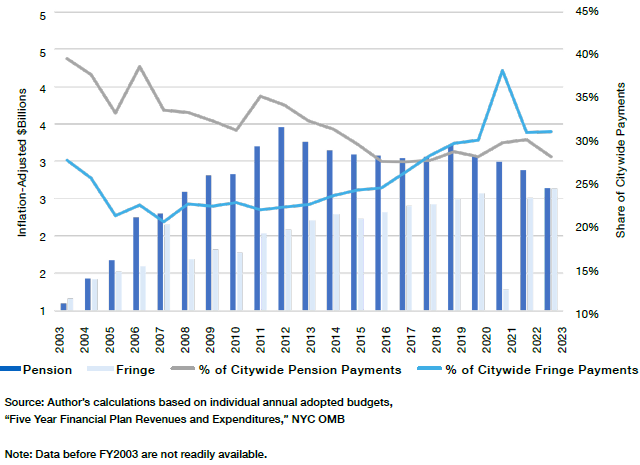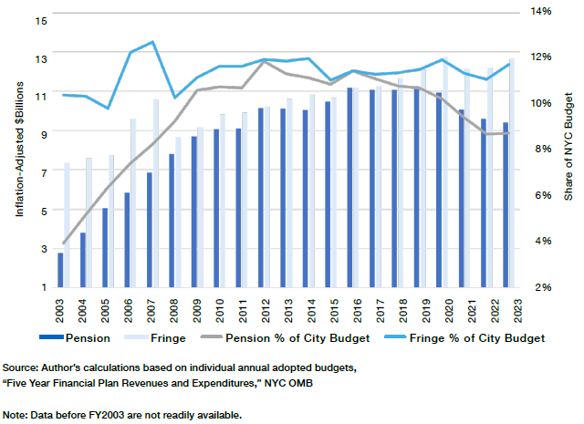Pension and Fringe-Benefit Costs as Share of City Budget for All Departments (FY2003–23)