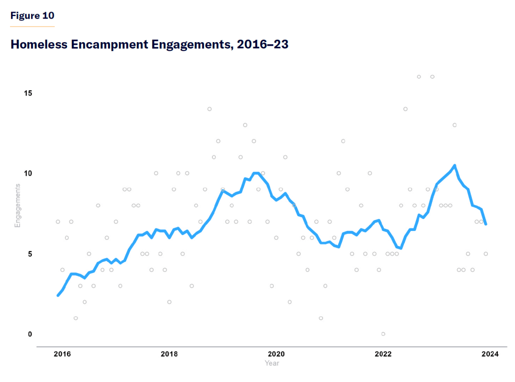 Camp clearance not only reduces public disorder and unsightliness; as several Manhattan Institute scholars have recently stated, “homeless encampments are unhealthy places that boast high rates of untreated mental illness, substance abuse, mortality, and crime.”[137] Permitting encampments to persist exacerbates this dysfunction; it is not humane. Camp clearance, by contrast, meaningfully reduces property, nuisance, and violent crime, with no evidence of displacement to adjoining areas.[138]