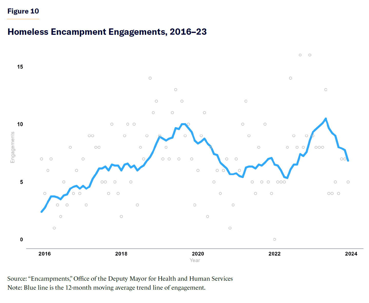 The District should continue its efforts to reduce homelessness by facilitating homeless residents’ transition to stable, long-term housing that is within their abilities to occupy. But they should also clear public encampments swiftly and without apology, stepping up enforcement using current encampment protocols and using the full force of the law to ensure that camps remain dispersed.