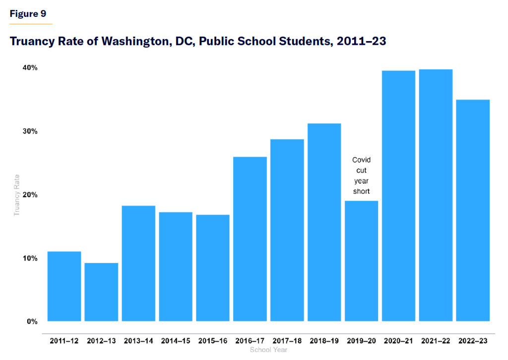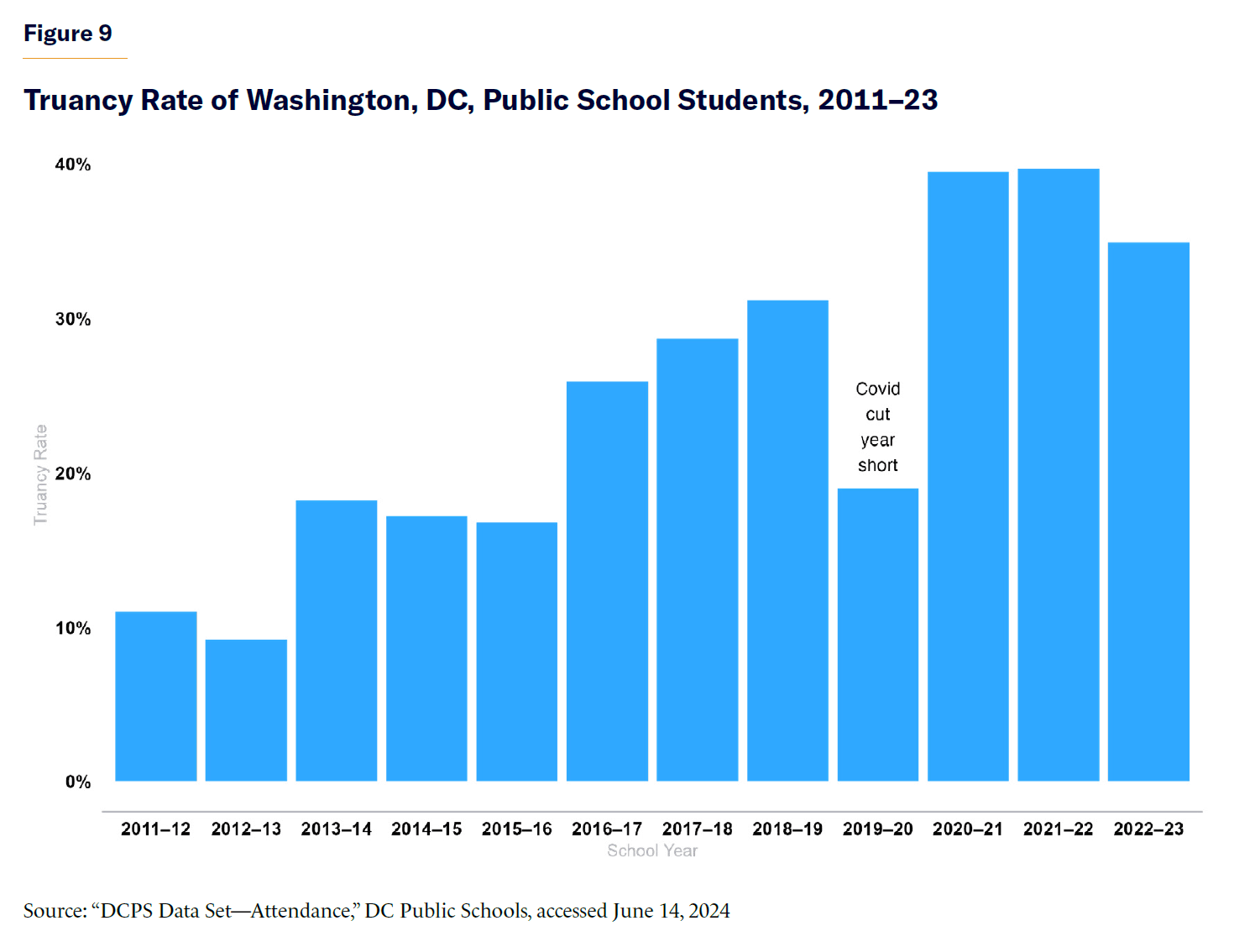 Most of DC’s existing truancy enforcement infrastructure does not focus on this nexus, preferring to identify truancy as a by-product of social disadvantage or a lack of resources. Mayor Bowser has recently moved to tighten up these programs but has continued to avoid the idea that truancy and crime are connected.[134] The DC attorney general’s office, which plays a role in truancy enforcement, also does not seem to see a relationship. As a representative of the office put it in 2022 testimony: “Prosecution, moreover, does not solve the underlying reasons that children are missing school.… OAG [Office of the Attorney General] has therefore shifted to using prosecution as a last resort, and OAG now looks for proactive approaches to reduce truancy—approaches that address the actual barriers that are causing kids to miss school.”[135]