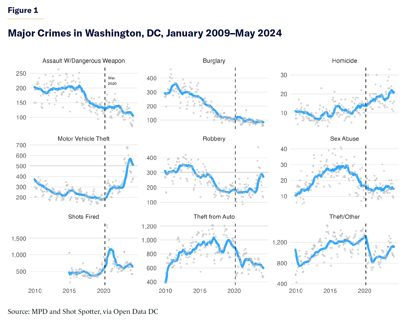 In short, Washington, DC, not only has acute problems with homicide and juvenile car theft. It also has a pervasive, albeit harder-to-measure, problem with disorder, homelessness, (possibly) shoplifting, and fare evasion—that is, petty crime.
