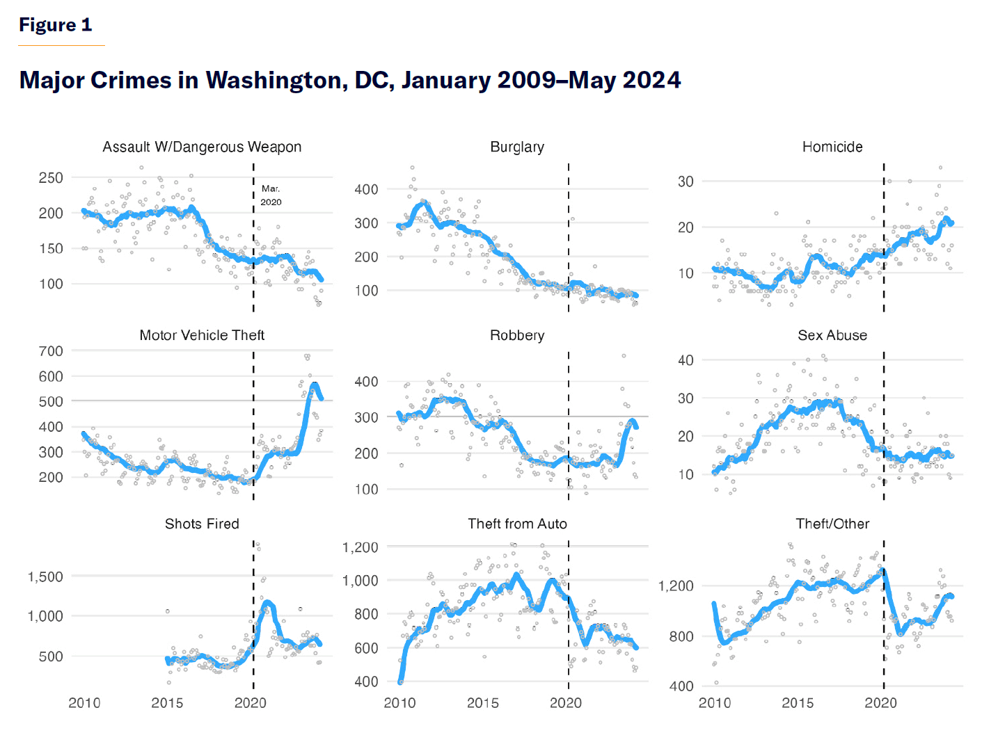 This report makes several contributions to the debate over crime in the District of Columbia. The first section presents data on crime in the District, identifying three distinct but related crime problems: a long-standing homicide and group-violence problem; adolescent crime, principally involving auto theft and carjacking; and public disorder, including fare evasion and uncontrolled unsheltered homelessness. The second section connects these trends to a systematic decline of activity in many components of DC’s crime-and-disorder control system, including reductions in police staffing and activity, in prosecution, in pretrial detention, in school attendance, in judicial staffing, and in camp clearance.