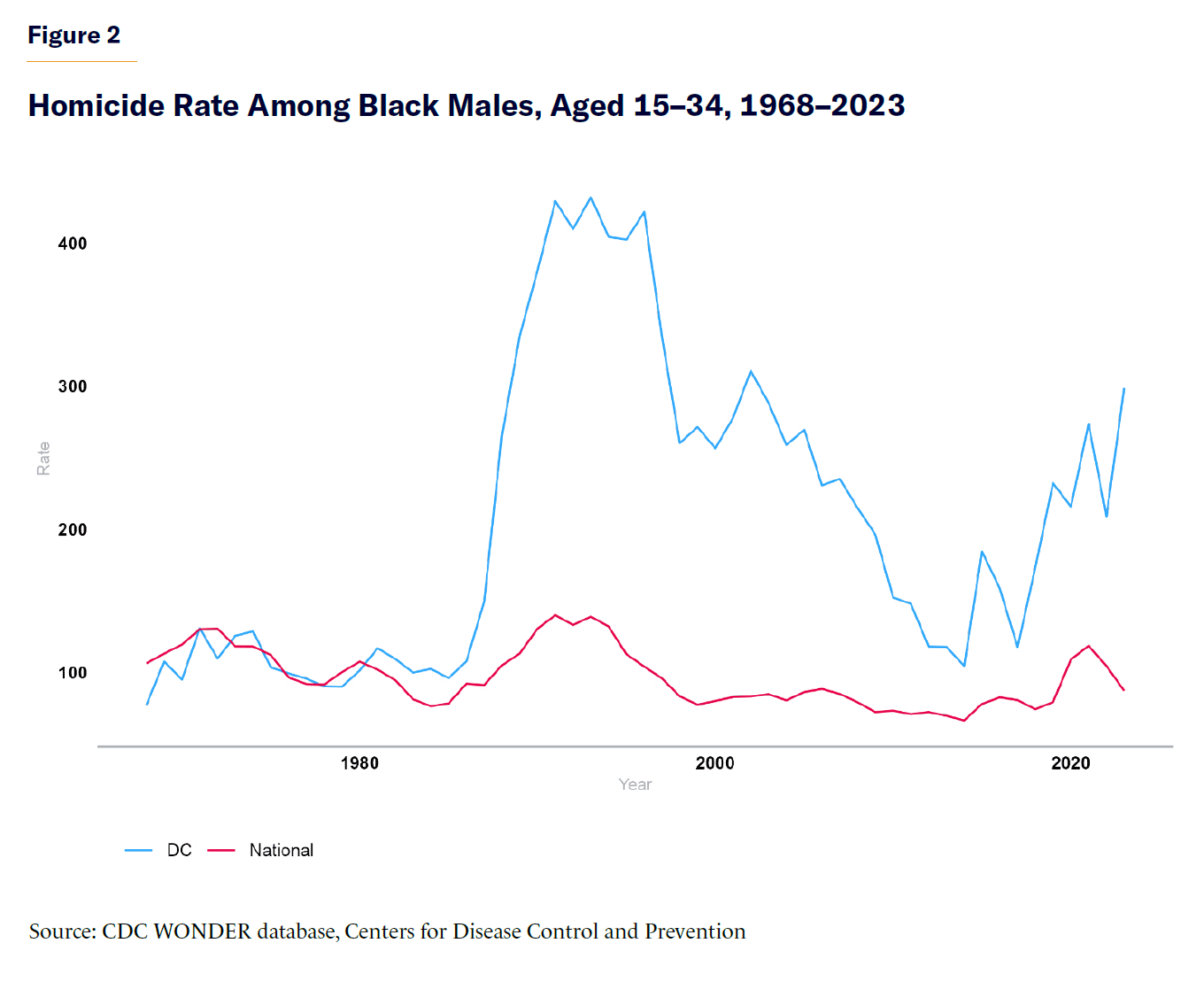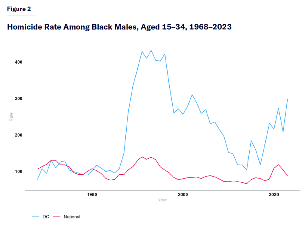 As the chart shows, homicide deaths in the city roughly tracked the national norm until the late 1980s, when the emergence of violent crack cocaine markets made DC the nation’s “murder capital.”[12] While the District enjoyed the fruits of the “great American Homicide Decline” of the 1990s, its homicide rate in this particular at-risk population remained elevated above the national rate. Additionally, it recently began rising precipitously—from a low of 104.5 deaths per 100,000 population in 2014 to a peak of 298.8 per 100,000 in 2023, a 186% increase. It is roughly as dangerous to be a young black man in the District today as it was 25 years ago.