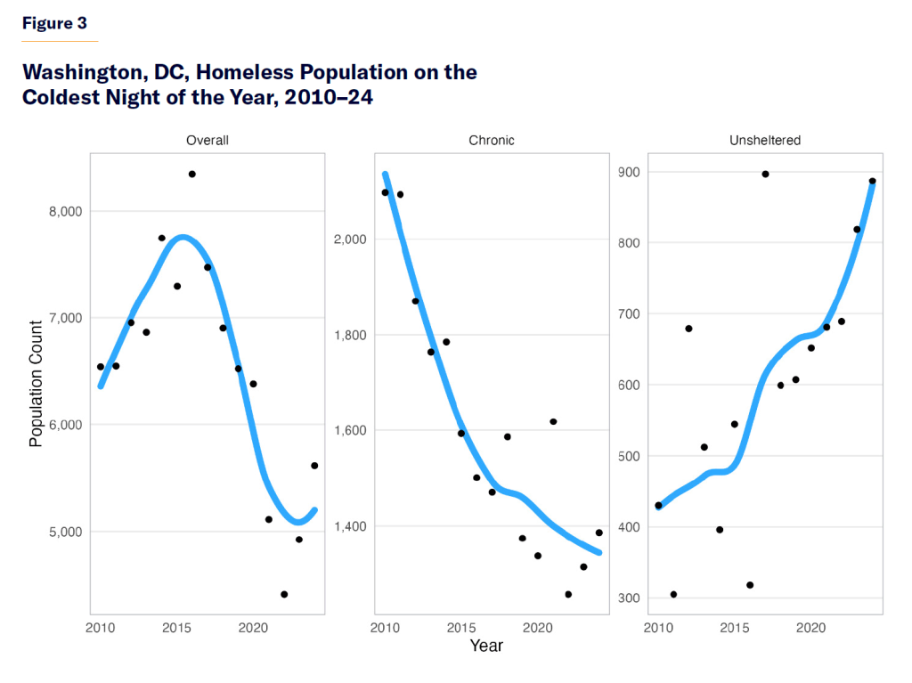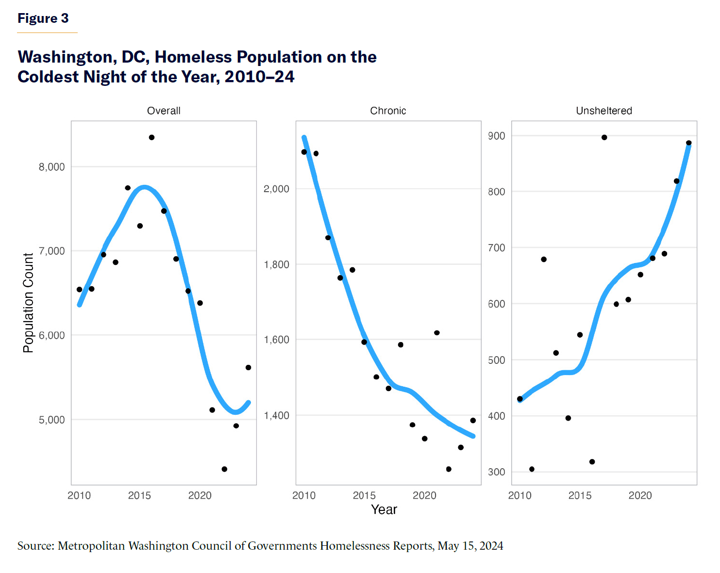 In fact, DC appears to have more of a visible homelessness problem than a homelessness problem per se. As Figure 3 shows, levels of overall homelessness in DC have fallen steadily, since peaking in 2016 (although they rose slightly in 2024).[34] The number of residents suffering from chronic homelessness—meaning being homeless for more than a year while suffering from addiction, serious mental illness, or other disability[35]—is below recent highs, suggesting that the total population most at risk of living on the street is declining. By contrast, the levels of unsheltered homelessness have risen since 2020, especially in 2023–24.[36]