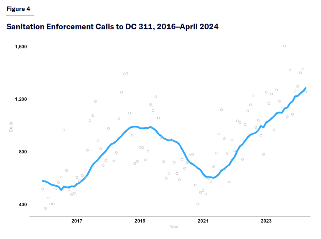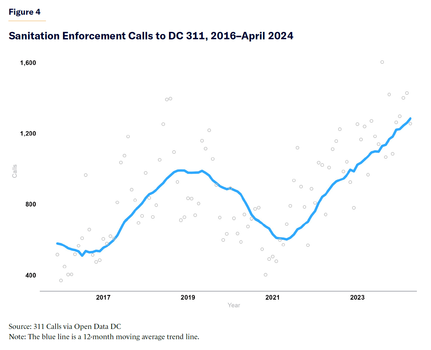 There is also increasing demand for public sanitation enforcement. As Figure 4 shows, calls to DC’s 311 line (for nonemergency city services) for sanitation enforcement fell during the early days of the Covid pandemic. But calls soon began rising again, with that increase showing little sign of abating in the most recent data. Rates of calls for enforcement remain substantially elevated over pre-pandemic highs. Although the data do not allow disaggregation of the specifics of the calls, they do paint a picture of a city that residents believe to be dirtier than it used to be.