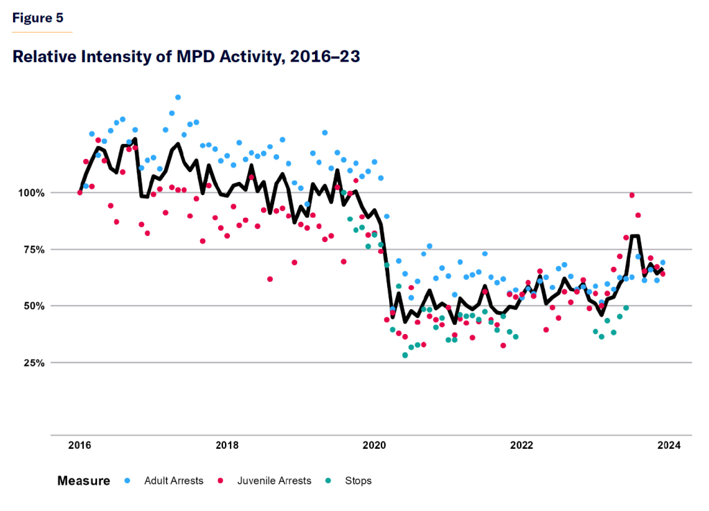 Figure 5 captures three measures—arrests of adults, arrests of minors, and stops—reported by MPD over the indicated periods. For comparability, each individual series is shown as a fraction of the first value in the series—in essence, showing changes in the relative level of each. The underlying trend—the average of the three,[45] depicted as a black line—is glaring. Beginning in March 2020 (coincident with the onset of the Covid pandemic), rates of all three plummeted to 25%–50% of pre-pandemic baseline. They have slightly recovered in the most recent data. That last increase is driven partly by MPD’s efforts to target juveniles committing auto thefts and partly by the priorities of MPD’s new chief, Pamela A. Smith.[46]