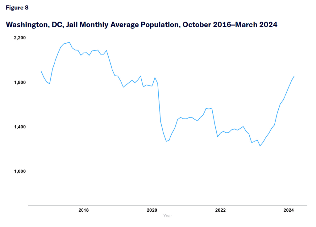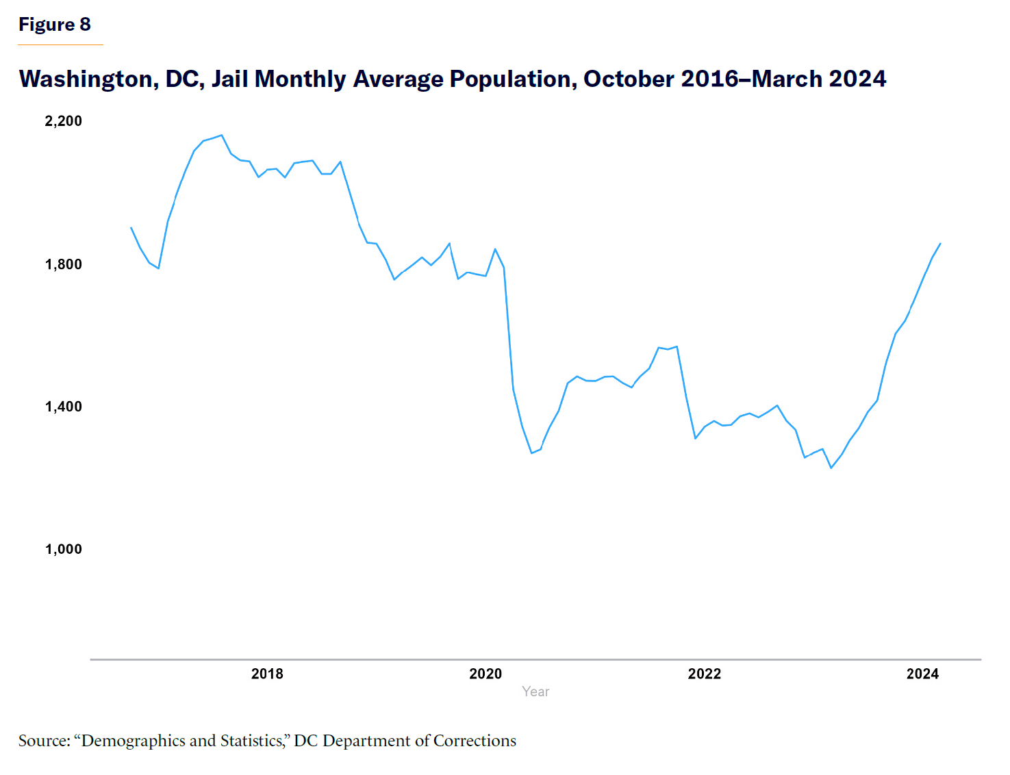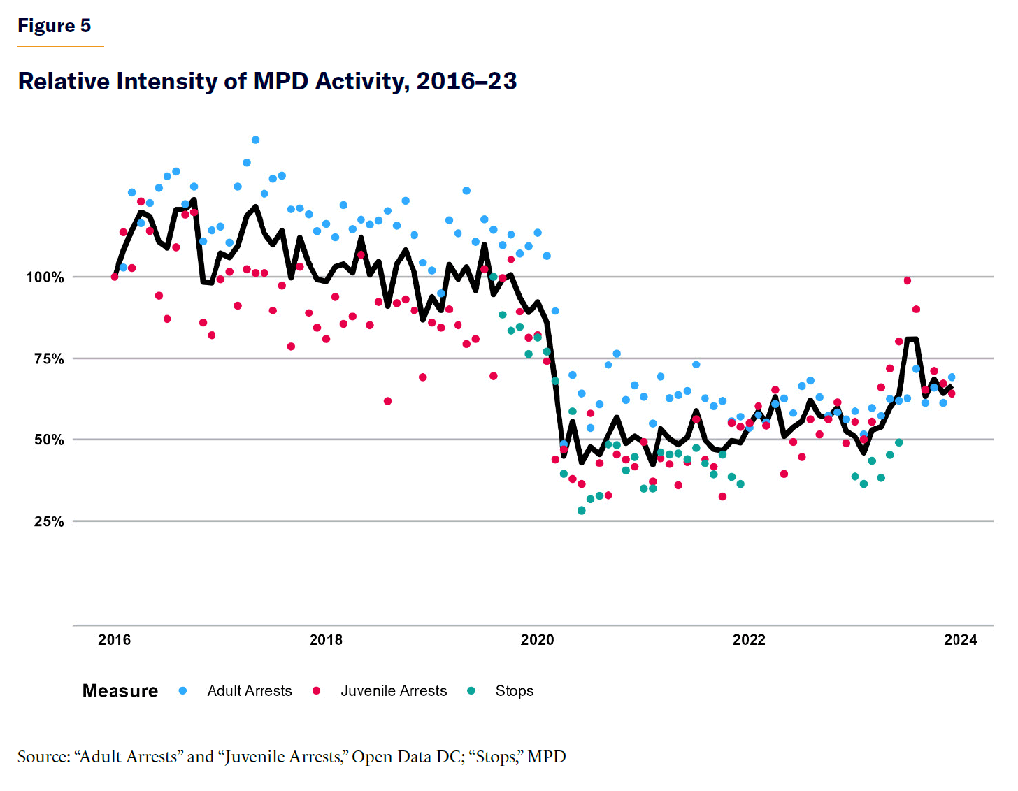 Part of the story must be that the various components of DC’s criminal-justice system simply have not recovered from the one-two punch of Covid and the Floyd protests. While other cities saw declines in activity from the criminal-justice system and then recovered, activity levels from DC’s criminal-justice system have not rebounded. Across measure after measure, its systems for controlling crime and disorder are running less well than they did four years ago.