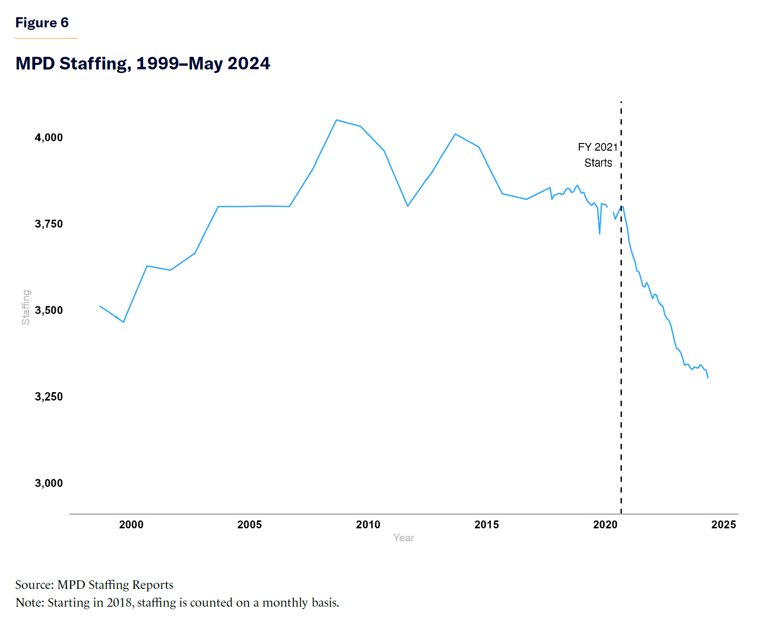 MPD in DC is the primary law-enforcement agency within the parts of the city that are not federal property. It is the sixth-largest police department in the United States.[44] Like peer departments, it has struggled over the past four years. And those struggles have persisted even as peer departments have rebounded.