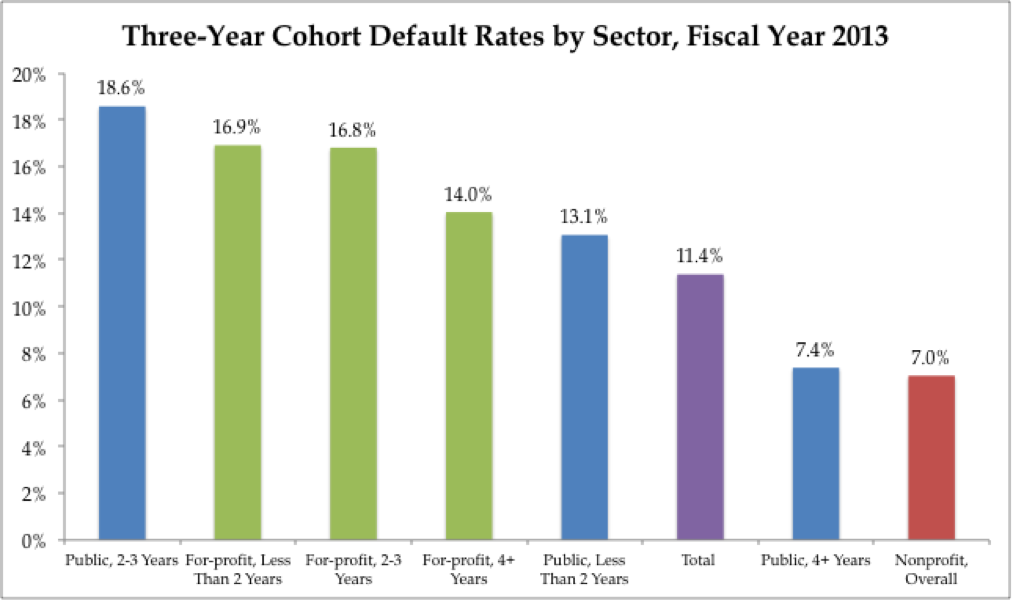 Certainly, for-profit colleges deserve closer scrutiny, particularly where taxpayer dollars are concerned. For-profits have a default rate of 15 percent, which is higher than the overall public sector rate of 11.3 percent. But this rate lumps in flagship public universities with community colleges. Among two-year institutions only, public schools fare worse, with a default rate of 18.5 percent, compared to 16.9 percent in the for-profit sector.
