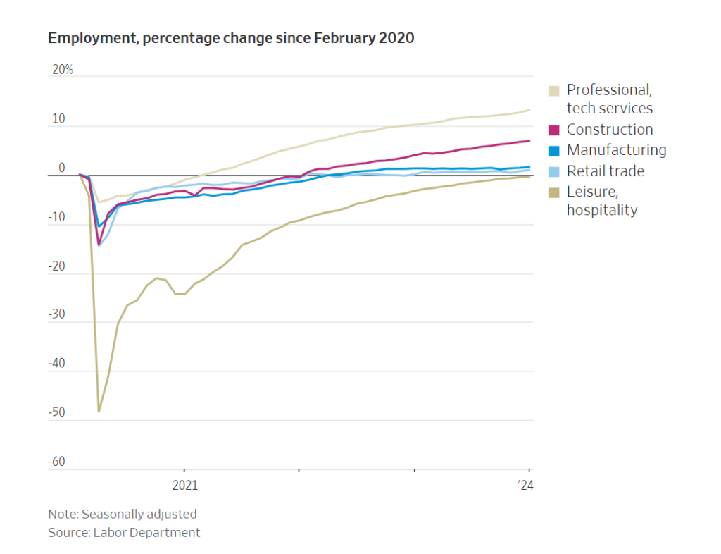 This aligns with a broader economic outlook for 2024: “a slowdown, but not a recession.” Moreover, this reversion to the mean reveals an important fact: the blue-collar workforce is a primary victim of volatility. A shifting economic environment can dictate their economic outlook, more-so than for white-collar workers. For example, those in the leisure and hospitality sector benefitted from disproportionate wage gains at the tail-end of the pandemic, as quarantine ended and the stir-crazy took vacations and spent lavishly. A recent infrastructure kick propelled construction employment last year. Conversely, the end of the pandemic’s e-commerce boom appears responsible for recent layoffs in the transportation and warehousing sectors.