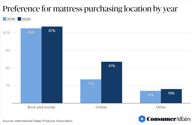 The pandemic is behind much of the shift toward digital storefronts. The decreased foot traffic was the final nail in the coffin for many in-person mattress locations, while brands with a digital presence came out ahead. Although most stores have reopened, customers’ shopping habits have changed – they are now willing to purchase a mattress online, without feeling it first.
