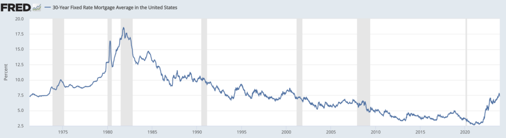 The housing market can be described as expensive and offering little choice. That is the result of years of very cheap mortgages, largely engineered by The Fed, and the existence of the 30-year fixed mortgage, also made possible by government policy. The figure shows the 30-year fixed mortgage rate, which hit record lows during the pandemic and is now back to historical averages. The current rates are more than doubled what rates were a few years ago. The result is many Americans have locked in a low mortgage payment and can't afford to move. Meanwhile, supply is constrained, which keeps prices high. Ownership will be expensive and inaccessible for people looking to buy, and moving will be impossible for current owners. This will make the economy less dynamic and impact wealth creation for years to come.