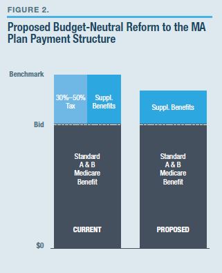The disincentive to increase efficiency and pass on the savings to attract enrollees can easily be remedied by reforming payments to MA plans from a complex bidding structure to a system by which they are simply paid the benchmark as a lump sum and allowed to pass on all efficiency savings to enrollees. This would effectively remove the tax on rebates and could be funded by legislation that is budget-neutral through a proportionate reduction of the benchmark (Figure 2).[65]