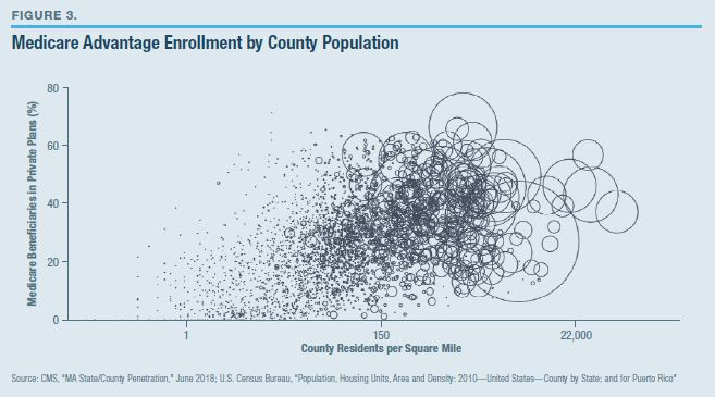 Enrollment in MA is significantly higher in urban than rural areas (Figure 3). In 2017, while the absence of insurers from the exchange in seven counties across the U.S. made headline news, MA plans were unavailable in 147 counties—even though total insurer revenues from MA are twice as great as those from the individual market.[66]