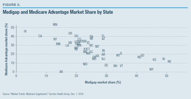 Because MFFS plus Medigap is a close substitute for MA, there is a strong negative correlation in enrollment between them. As Medigap premiums in particular regions increase, so does enrollment in MA, regardless of the availability of zero-premium MA plans in the area (Figure 5).[77]