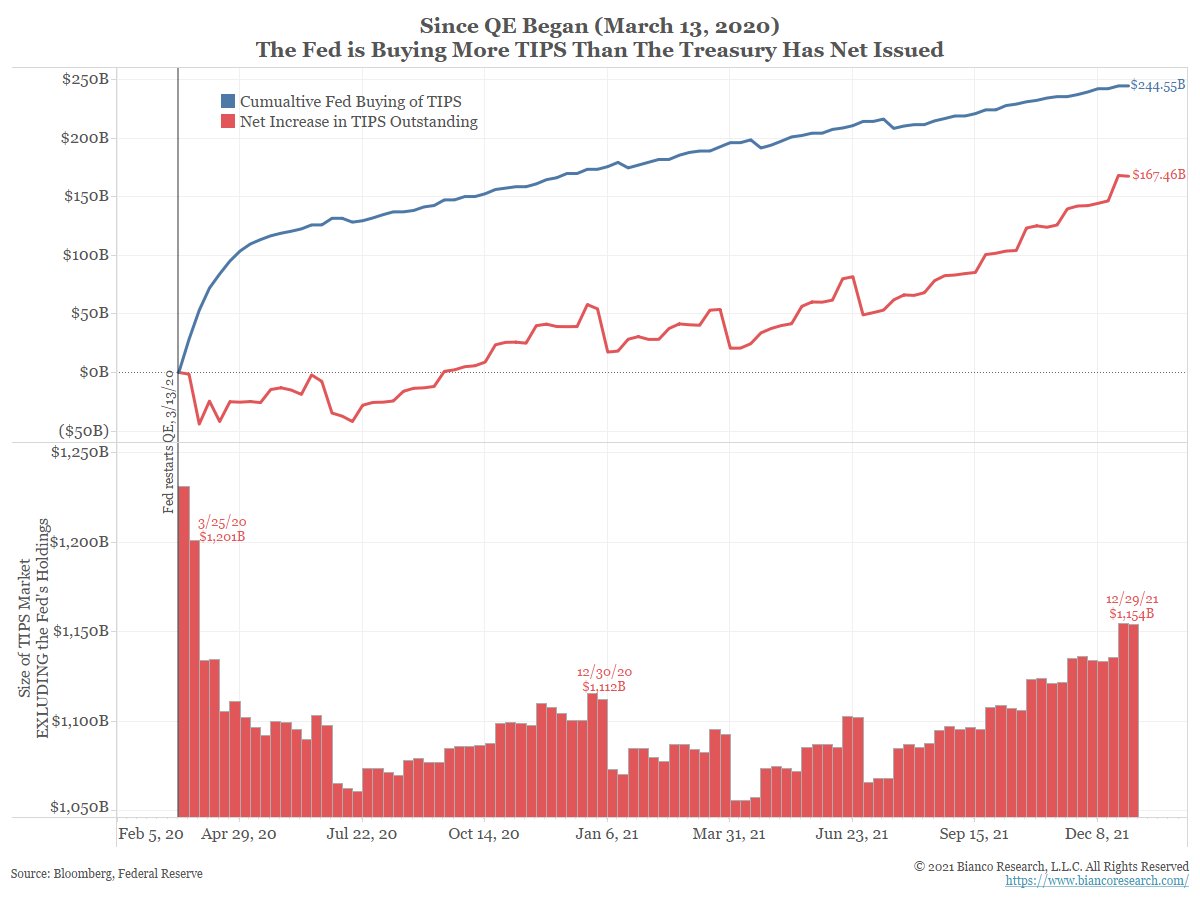 The breakeven rate is up, but not as much as you might think after a year where inflation was more than 6%. Some commentors point to the bond market as evidence that we needn't worry about inflation. But economists never expected that the biggest buyer of TIPS would be the Fed. According to calculations by Jim Bianco at Bianco Research, the Fed now owns 25% of the TIPs market and bought more TIPs in the last 2 years than the Treasury issued. The bond market has never been a reliable indicator of future inflation, but it is even less meaningful today.