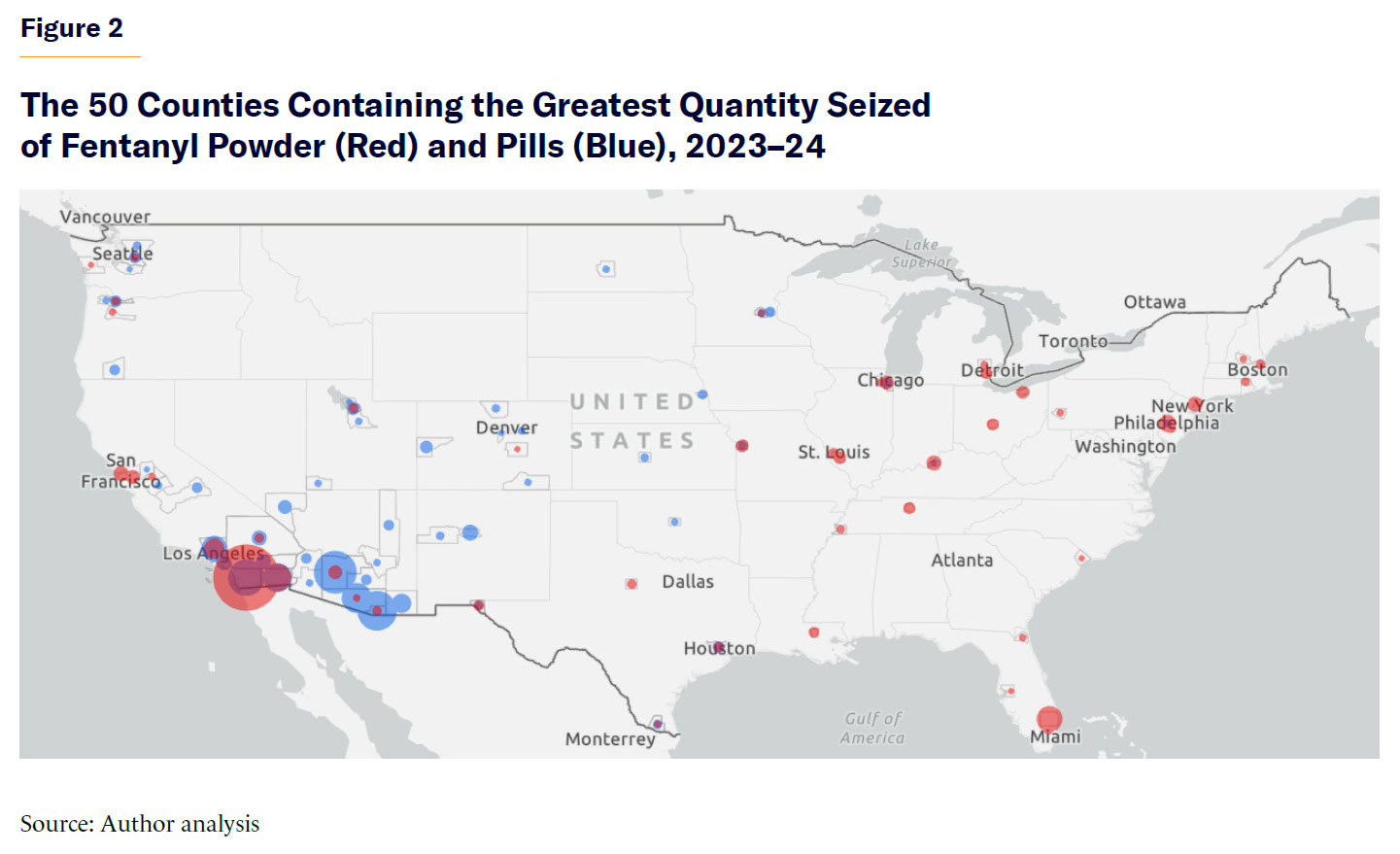 Figure 1 shows the locations of the 50 largest powder seizures (red circles) and the 50 largest pill seizures (blue circles) in the 2023–24 data. (There are fewer than 100 circles because one county can have more than one of the largest seizures.) The sizes of the circles indicate the size of the largest seizure in that county.