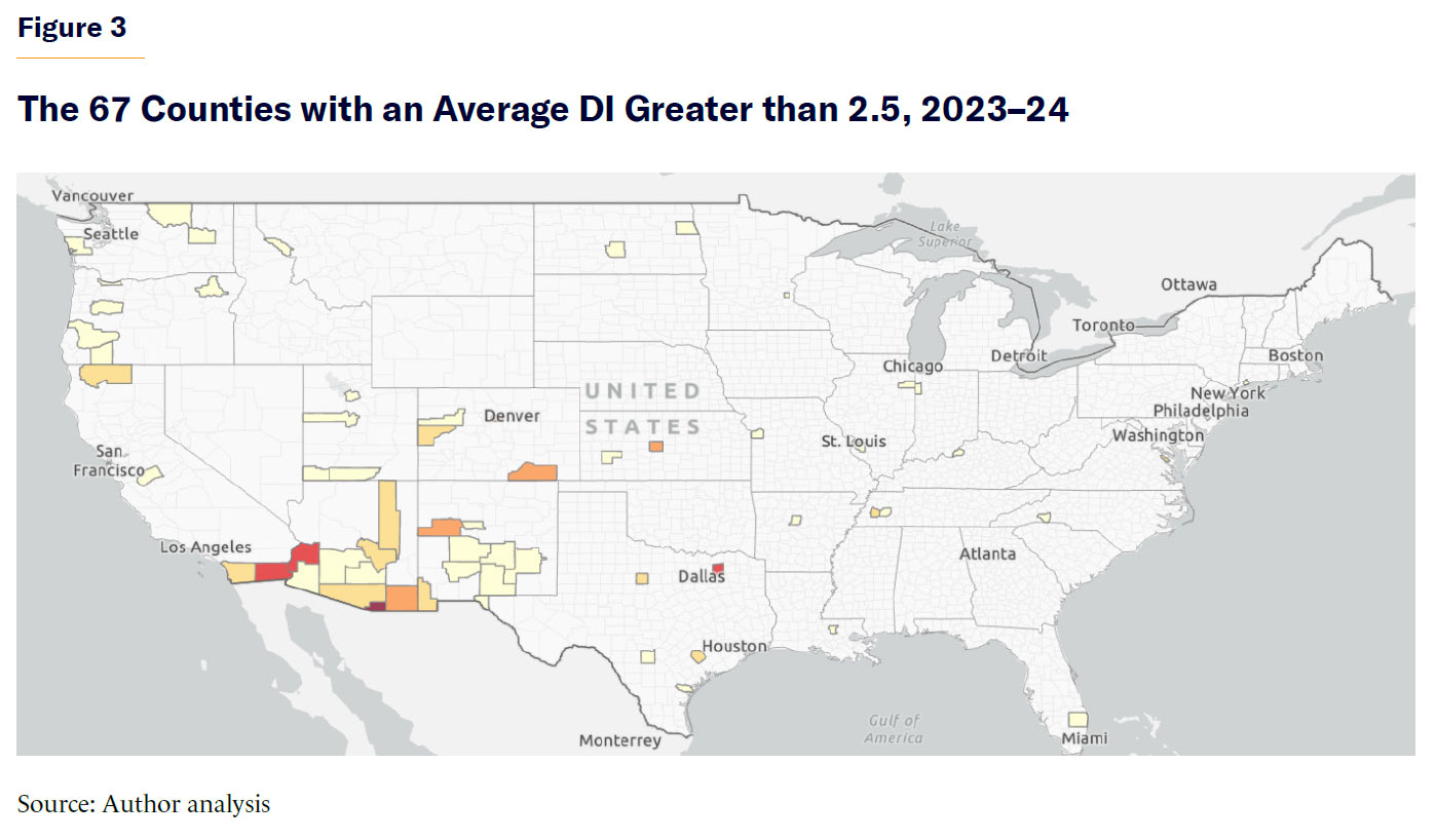 Figure 3 is a heatmap color-coding all counties in the lower 48 states based on their average DI score in 2023–24. White indicates an average DI below 2.5. For the other 67 counties, the darker the shade, the higher the average DI score.
