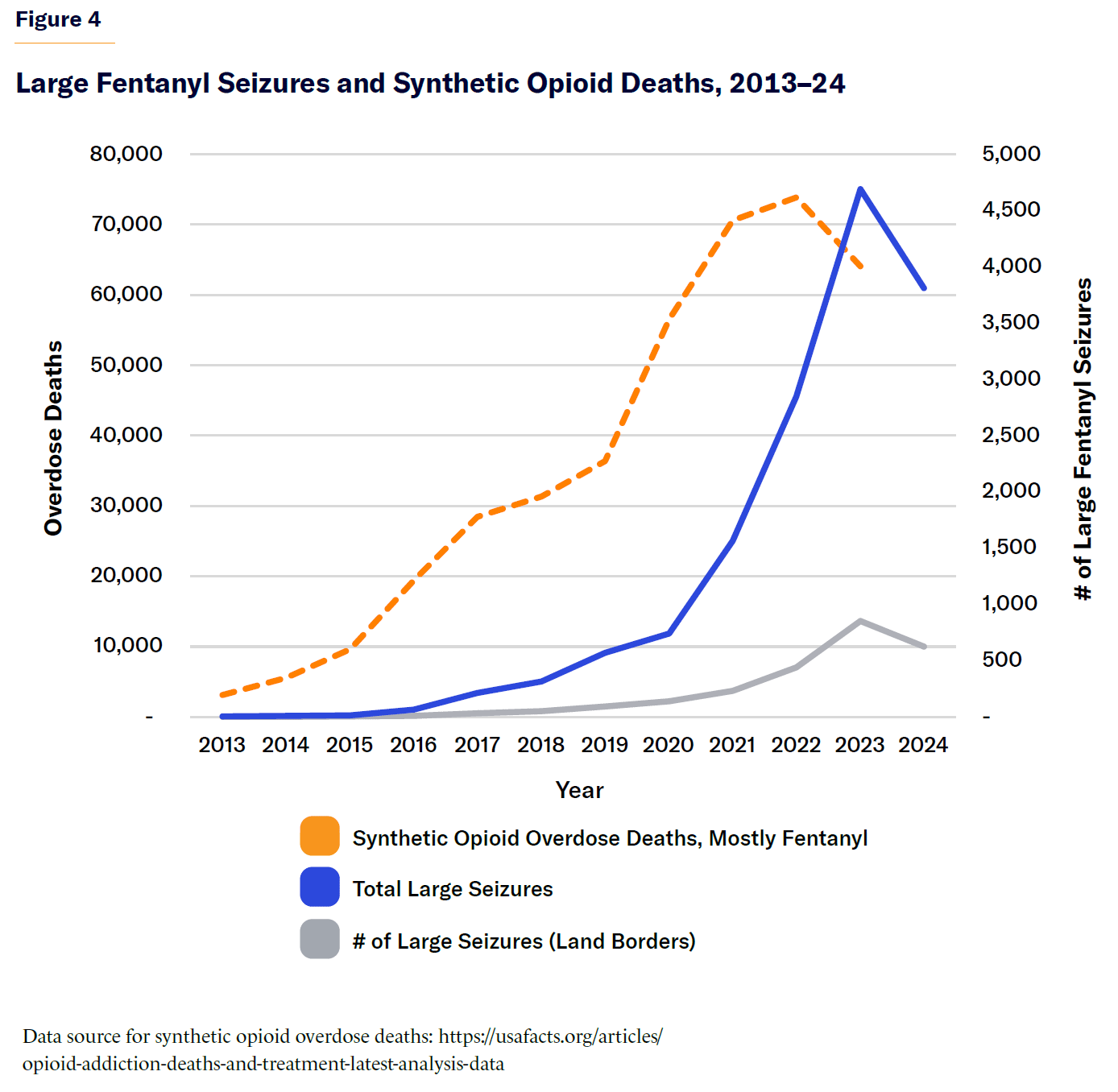 We plot trends in the number of large fentanyl seizures, combining powder and pills, both nationwide and along land borders (Figure 4). We overlay on the same graph (using the right-hand vertical axis) the total number of synthetic opioid overdose deaths (mostly fentanyl). Unsurprisingly, the trends are broadly parallel, although the overdose rate rose first—perhaps because enforcement policy responded to the problem, but with a slight lag.