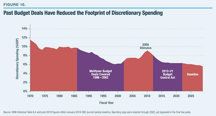 The result? Past deals have reduced discretionary spending from 10% of GDP in 1983, to 6% of GDP in 2019—on its way to a projected 5% of GDP within a decade.[93]This would represent a post-1930s low and leave little room for additional discretionary spending relief in future deals. In any case, past discretionary caps have been repealed or replaced within a few years of enactment.
