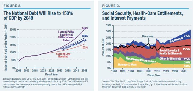 The case for deficit reduction is growing even as Congress generally ignores the issue. CBO projects that the budget deficit will rise to 9.5% of GDP over the next 30 years, and that assumes peace, prosperity, low interest rates, and the expiration of most of the 2017 tax cuts.[1]