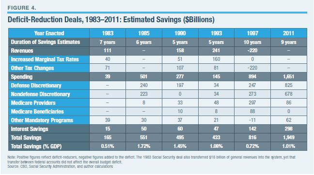 Trillion-dollar annual deficits and steeply rising debt will eventually force Congress and the White House to negotiate a fiscal consolidation. The only question is whether they will phase in gradual reforms soon or wait for an economic crisis to force drastic reforms. In any event, no grand bargain will take place without at least two of the three “primary ingredients” that emerge from the experience of the last several decades.