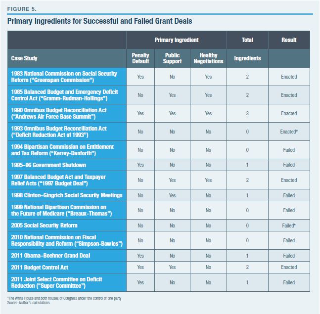 The following 14 case studies constitute the largest grand-deal deficit negotiations since 1983. Six of them resulted in enacted legislation (summarized in Figure 4 and Figure 5), and eight did not. The vast majority of these case studies show that a large bipartisan deal requires at least two of the three primary ingredients described earlier.