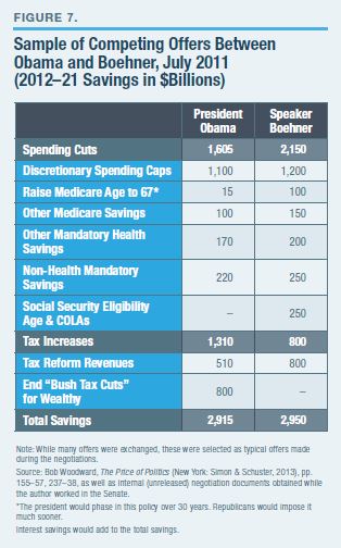 White House and congressional leaders began a lengthy series of negotiations. The 25-person “Biden Group”—led by the vice president and Republican House Majority Leader Eric Cantor—began talking in May 2011. Despite progress on small deficit-reduction reforms, this group disbanded when it was discovered that Obama and House Speaker John Boehner were engaging in their own negotiations. Figure 7 shows a sample of the leading offers from Obama and Boehner. Taxes as well as the size and pace of major entitlement reforms divided the two sides. The Obama–Boehner group—which expanded to include other congressional and administration leaders—eventually failed to reach a grand deal. It foundered on the fundamental division between Republicans and Democrats over taxes and entitlements. The group would move on to a discretionary spending deal that is taken up below.