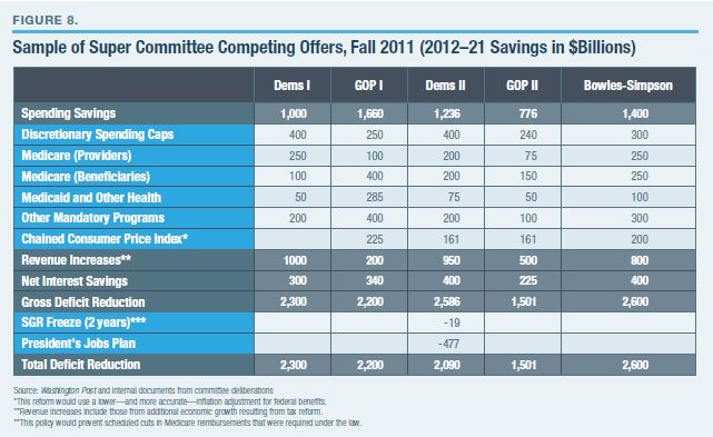 Figure 8 shows a sample of competing offers within the Super Committee (including a bipartisan proposal presented at a hearing from Erskine Bowles and Alan Simpson). The failure to enact alternative reforms triggered an additional $1,032 billion in 2012–21 savings ($1.2 trillion scored against an earlier baseline), consisting of lower defense spending caps ($454 billion), nondefense discretionary spending caps ($303 billion), automatic cuts to Medicare providers ($86 billion) and other nonexempt mandatory programs ($48 billion), and the resulting savings in interest on the debt ($142 billion).[74]