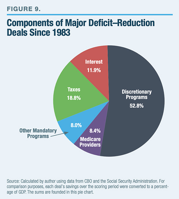 More than half of all savings in major deficit-reduction deals since the early 1980s have come from discretionary spending cuts (relative to the baseline of inflation-based growth rates). These cuts typically come in the form of tight statutory discretionary spending caps that last from five to nine years and are enforced by sequestrations (Figure 9).